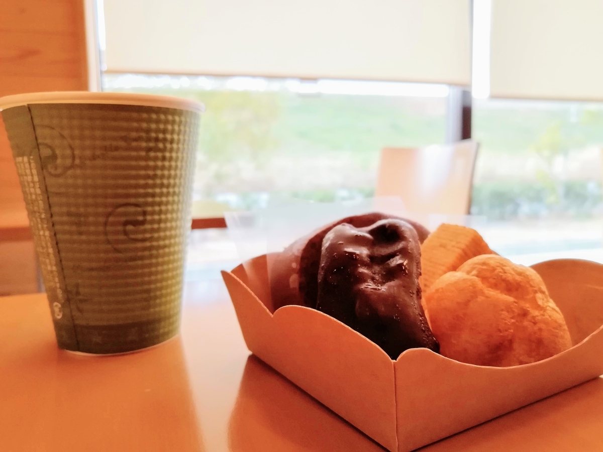 日替わりのお菓子の盛り合わせにドリンクを組み合わせたスイーツセット。この日のお菓子はシュークリーム、エクレア、バウムクーヘン、ロールケーキの4種類でした。これだけ種類があって、さらにドリンクがついてこの値段はお得です。