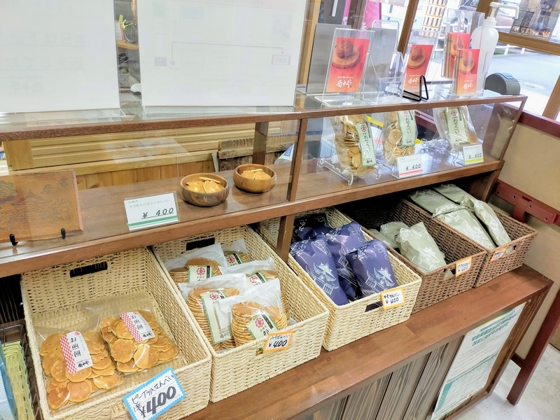 作業場の隣が売り場となっていて、お菓子が並んでいます。こちらはゆずせんべいやみそせんべい等の煎餅系のコーナー。そうめんバチ入りせんべいというのもあるようです。