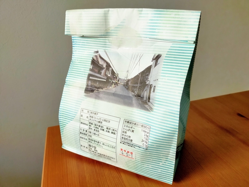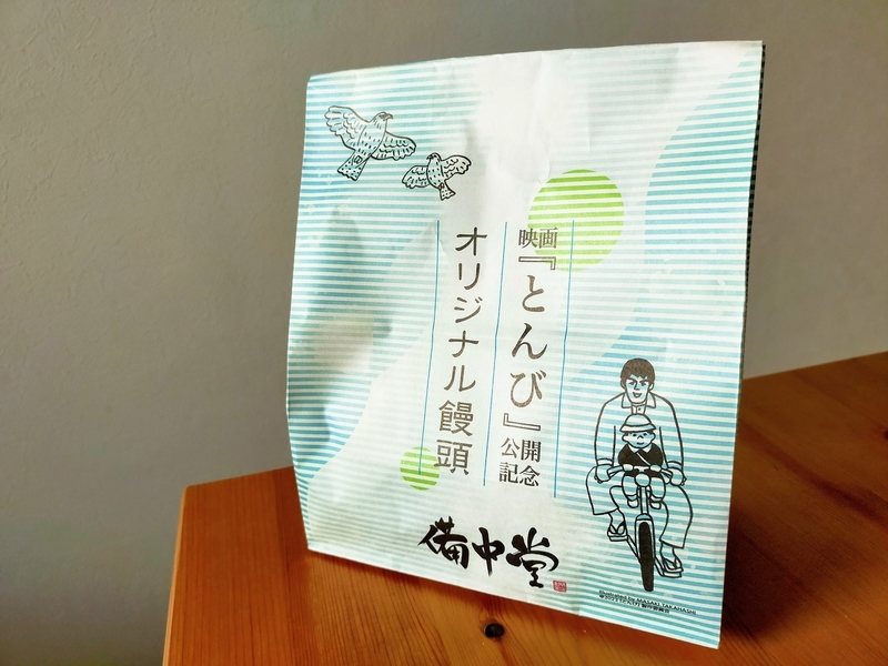 この門前町でロケが行われた映画「とんび」の公開を記念して作られたオリジナル饅頭です。映画の公式イラストを使った紙袋に入っています。