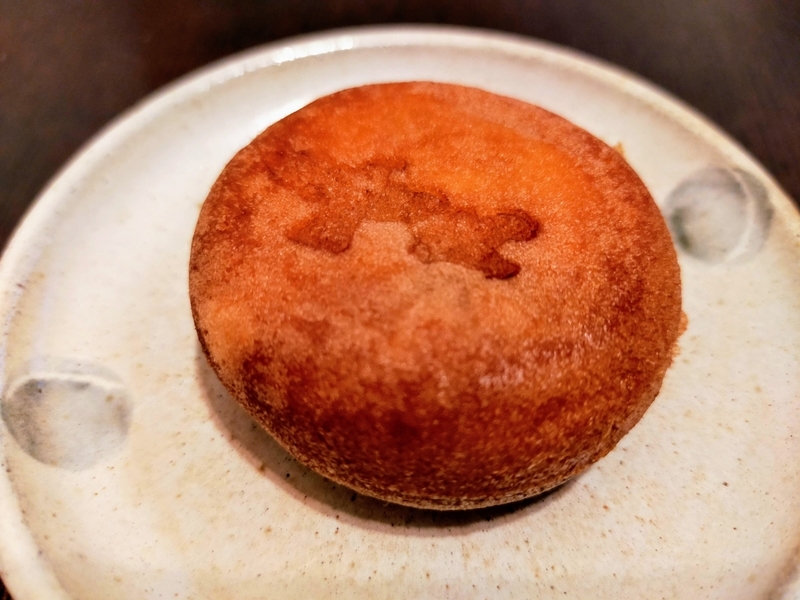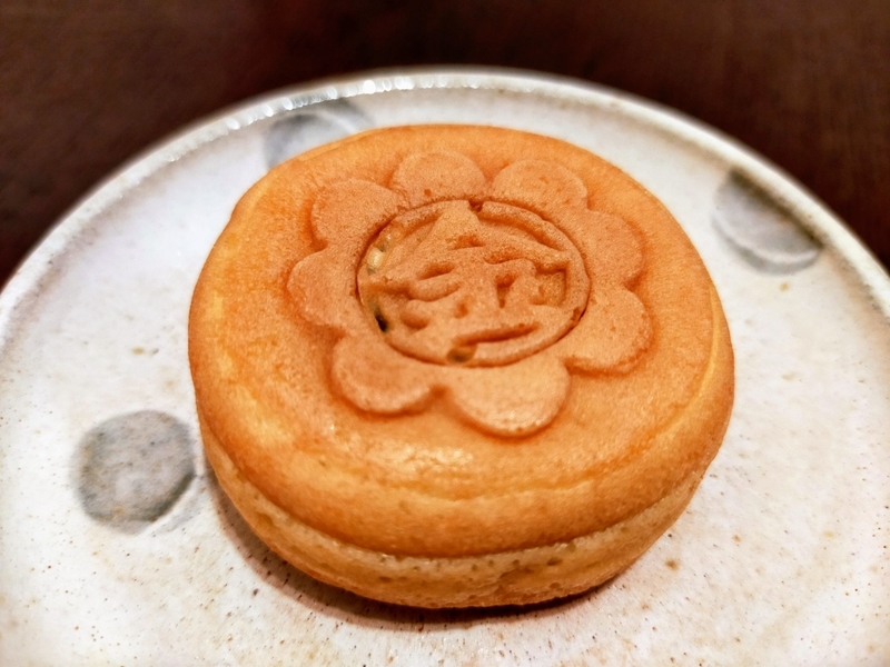こげ茶色の丸い饅頭には、映画にちなんで「とんび」の焼き印が入っています。ただちょっとこの焼き印が分かりづらい。見た感じ、焼き印がそこそこうまくいった饅頭と、あまりうまくいかなかった饅頭を組み合わせてペアにしている雰囲気です。焼き印がばっちり決まったのがあると良かったのですが、ま、味には影響がないので問題ありません。