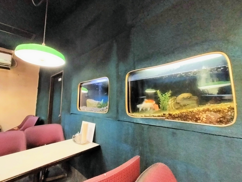 そして壁にはなんと水槽が埋め込まれています。このお店は「水族館カフェ」と呼ばれることもあるようで、熱帯魚や金魚、ザリガニなどを見ることが出来ます。なかなかの異空間で楽しいです。