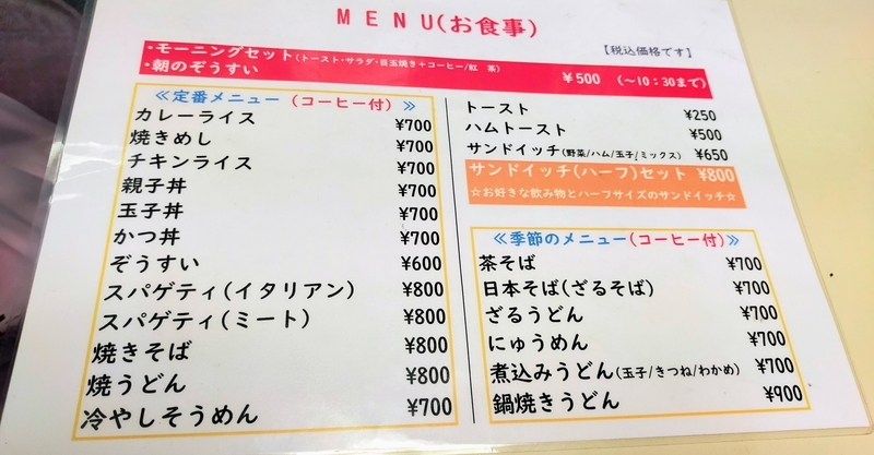 食事メニュー。サンドイッチなどの軽いパンメニューから、カレー、丼、麺類のしっかりとした食事メニューもあります。しかもコーヒー付きでこの値段。リーズナブルです。