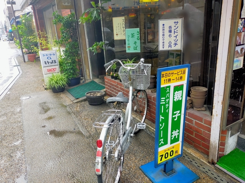 ランチは、11時から14時限定の「本日のサービス品」というものがあるようで、メニューは表の看板で確認できます。この日は親子丼とスパゲティミートソース。こちらもコーヒー付で700円は安い。