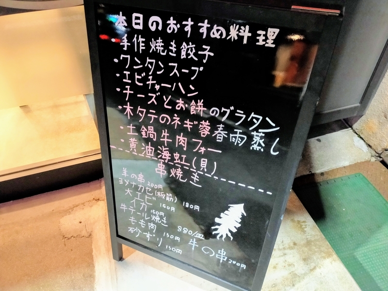 お店の前には本日のおすすめ料理が書き出されたブラックボードが出ています。中華料理屋ですが「ホタテのネギ蓉春雨蒸し」「黄油海虹」など、あまり聞き慣れぬメニューが並んでいてそそられます。「ホタテ」が「木タテ」となっているところもグッときます。