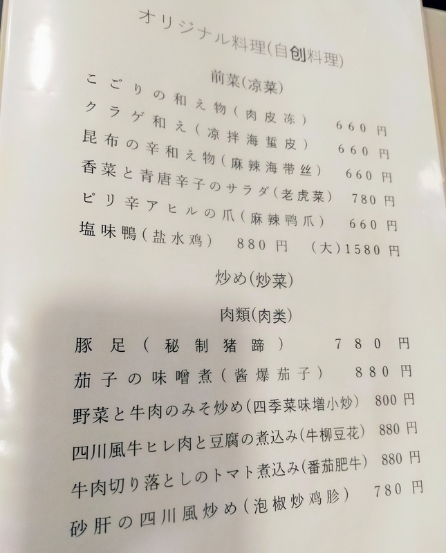 ここからオリジナルの創作中華メニュー。豚足(秘制猪蹄)やアヒルの爪(麻辣鴨爪)もあります。