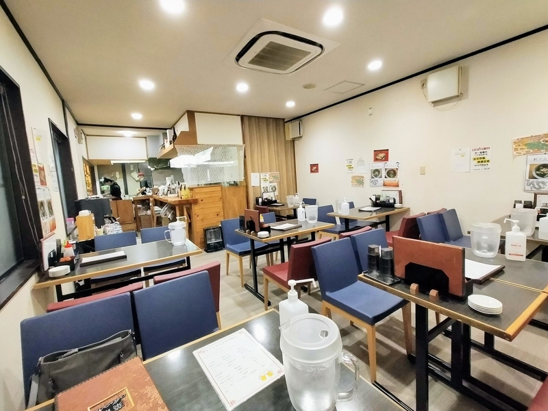 入り口すぐの場所に小あがりの座敷席がありましたが、ここはお店の方が使用するスペースのようです。その先を右に曲がるとテーブル席が並ぶ一帯。テーブルがぴっちりと並べられていて、独特の配置です。