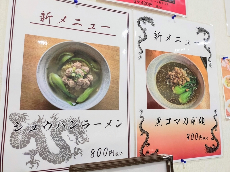 壁メニュー。左の「シュウハンラーメン」がどんなものなのか、気になります。