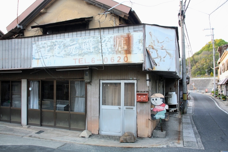 線路をくぐってそのまま進んだところには(元)鮮魚店。とぼけた顔の飛び出し坊やがいい味を出しています。