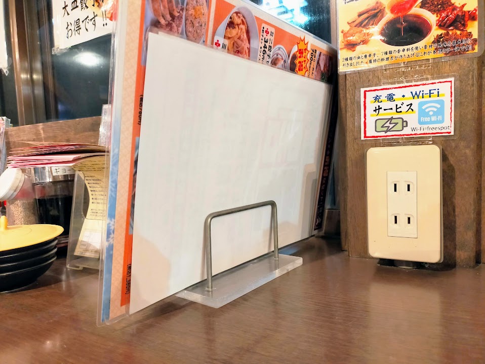 ちなみにここの二人席はテーブルが狭く、壁側の席の後ろにメニューや箸、調味料が設置されています。