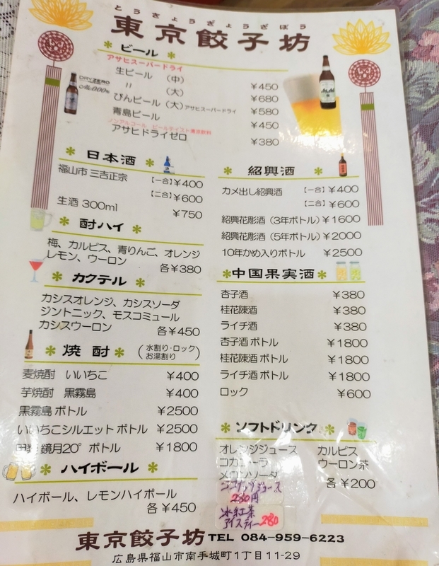 下記記事で紹介した福山市にある中華料理屋「東京餃子坊」のメニューの紹介です。