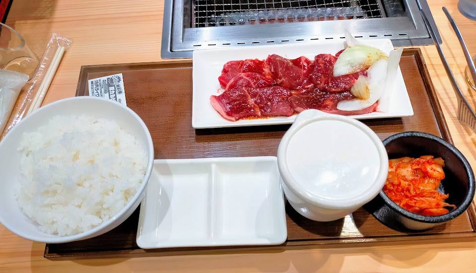 セットには、肉にご飯、スープ、キムチ、玉ねぎがついています。